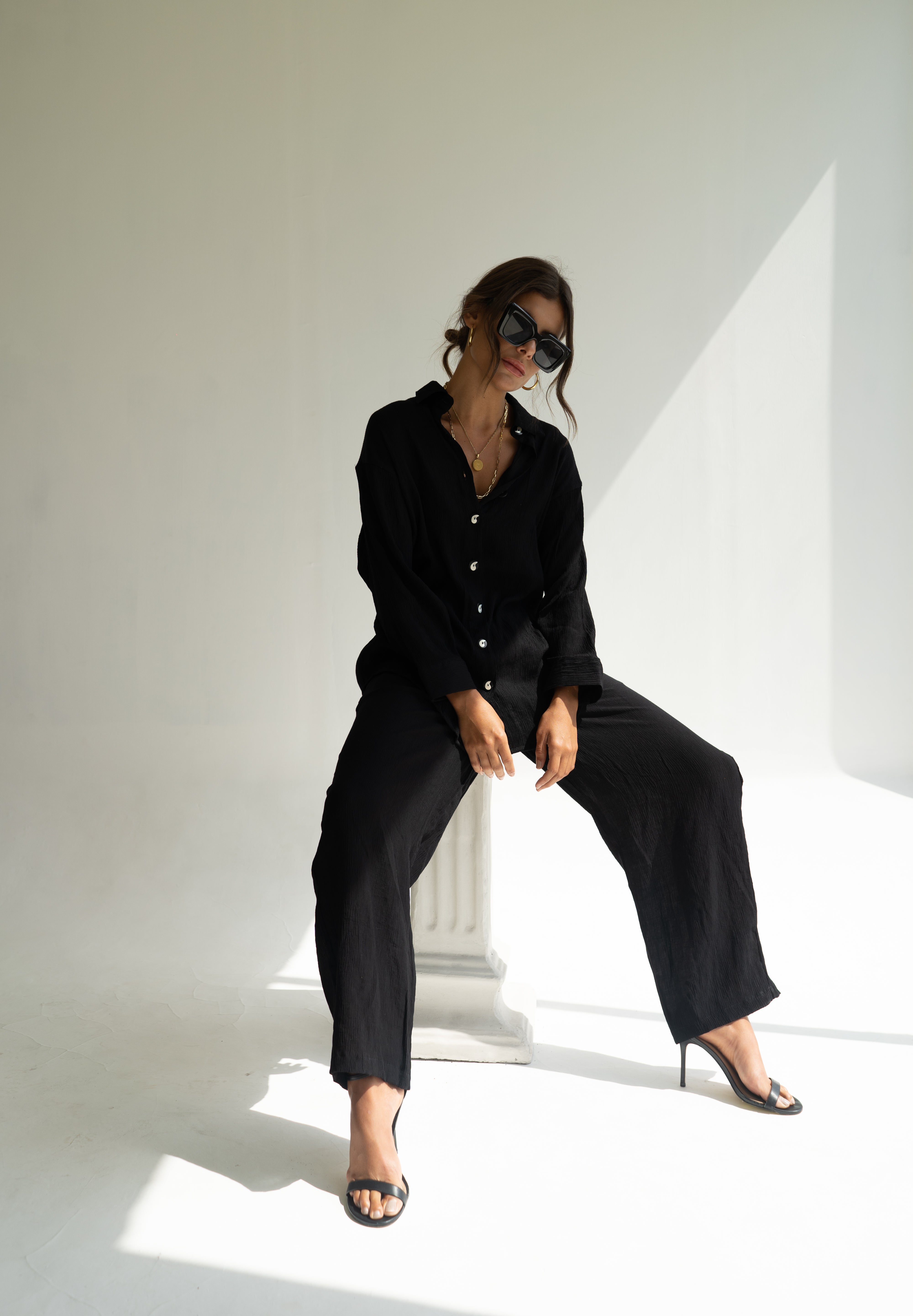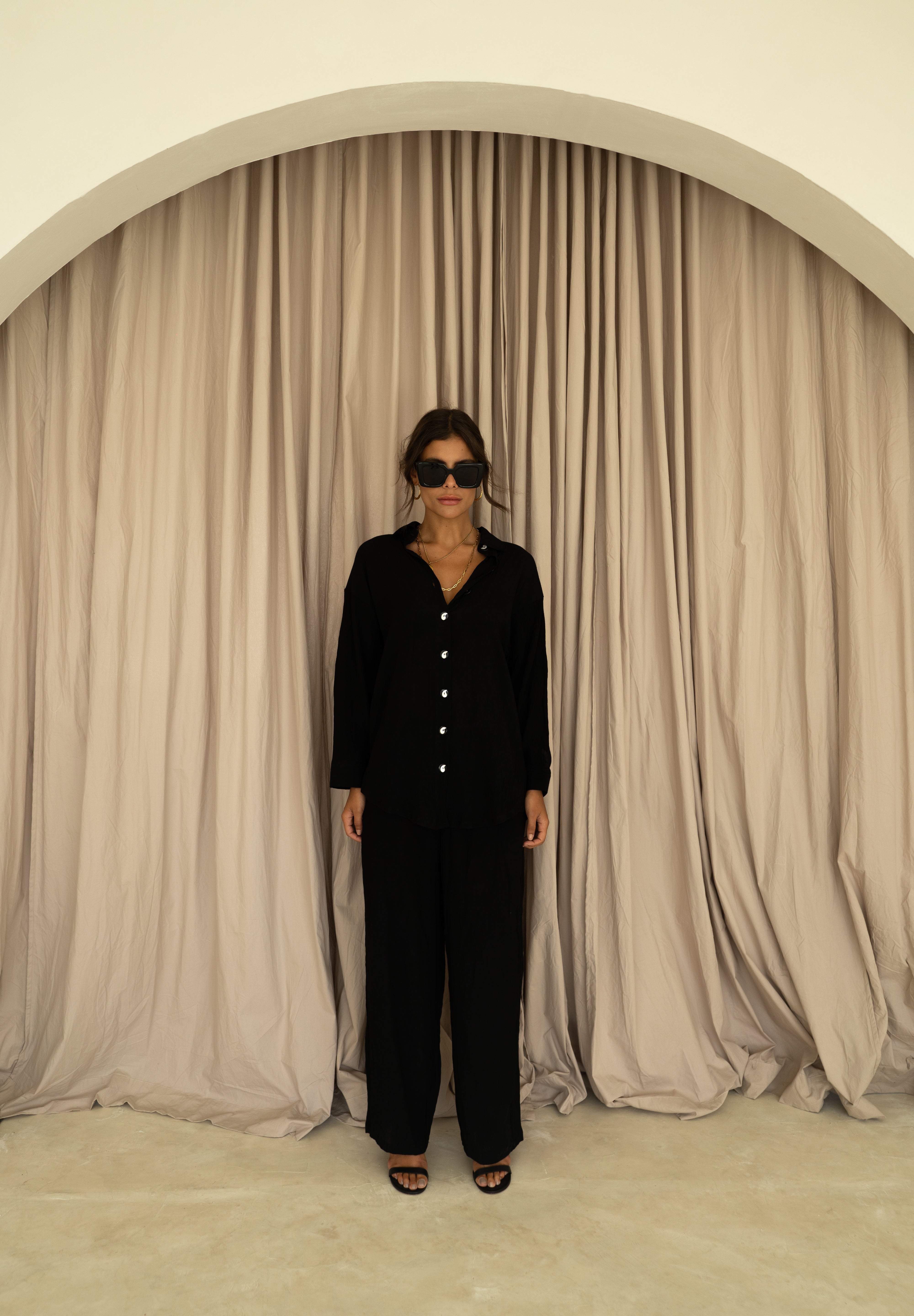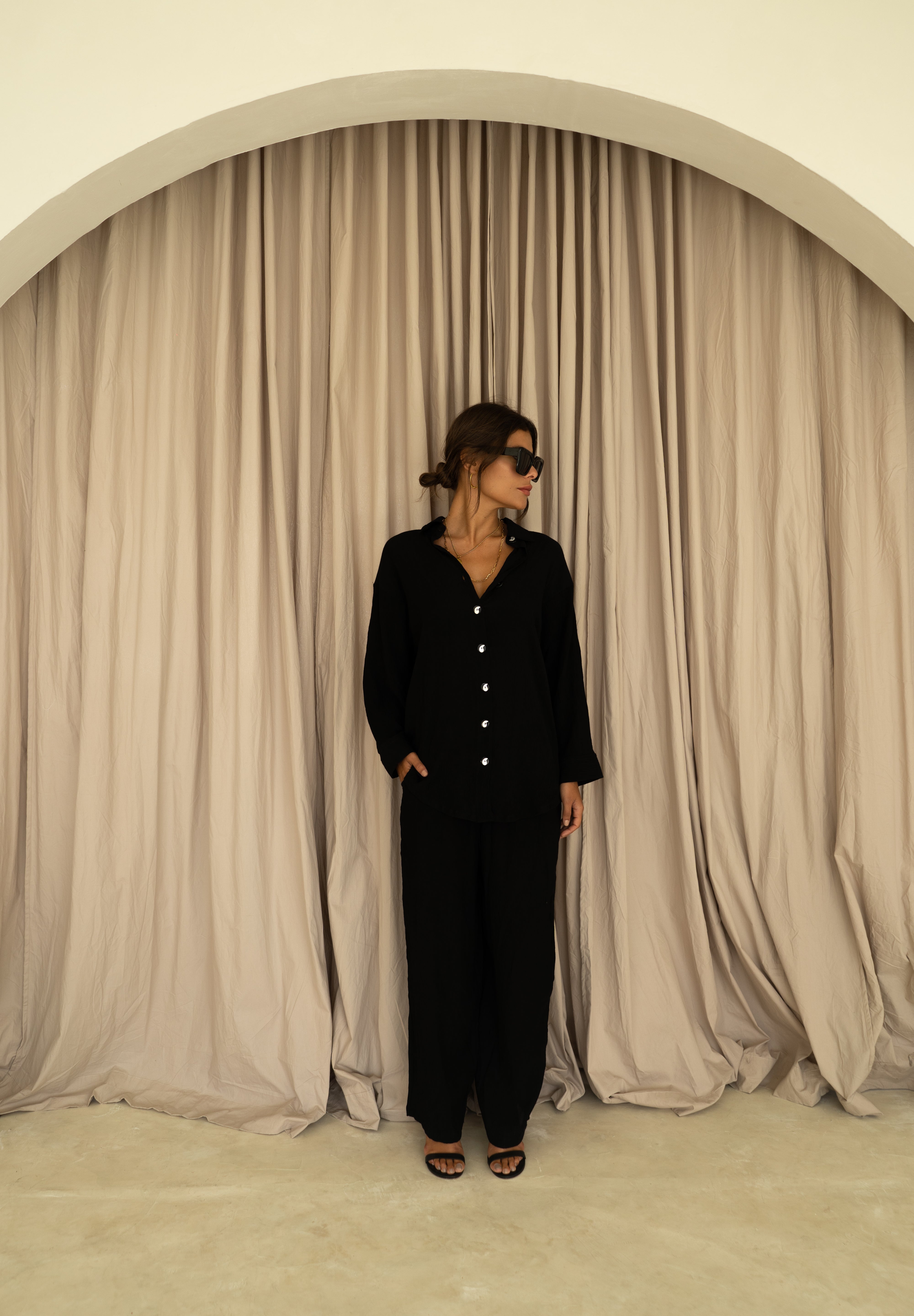 The Cotton Crepe Set is handcrafted from a smooth, textured 100% cotton crepe. It has a timeless oversized fit. The Pants have a comfortable waist elastic and the shirt has a unique Yin Yang design.