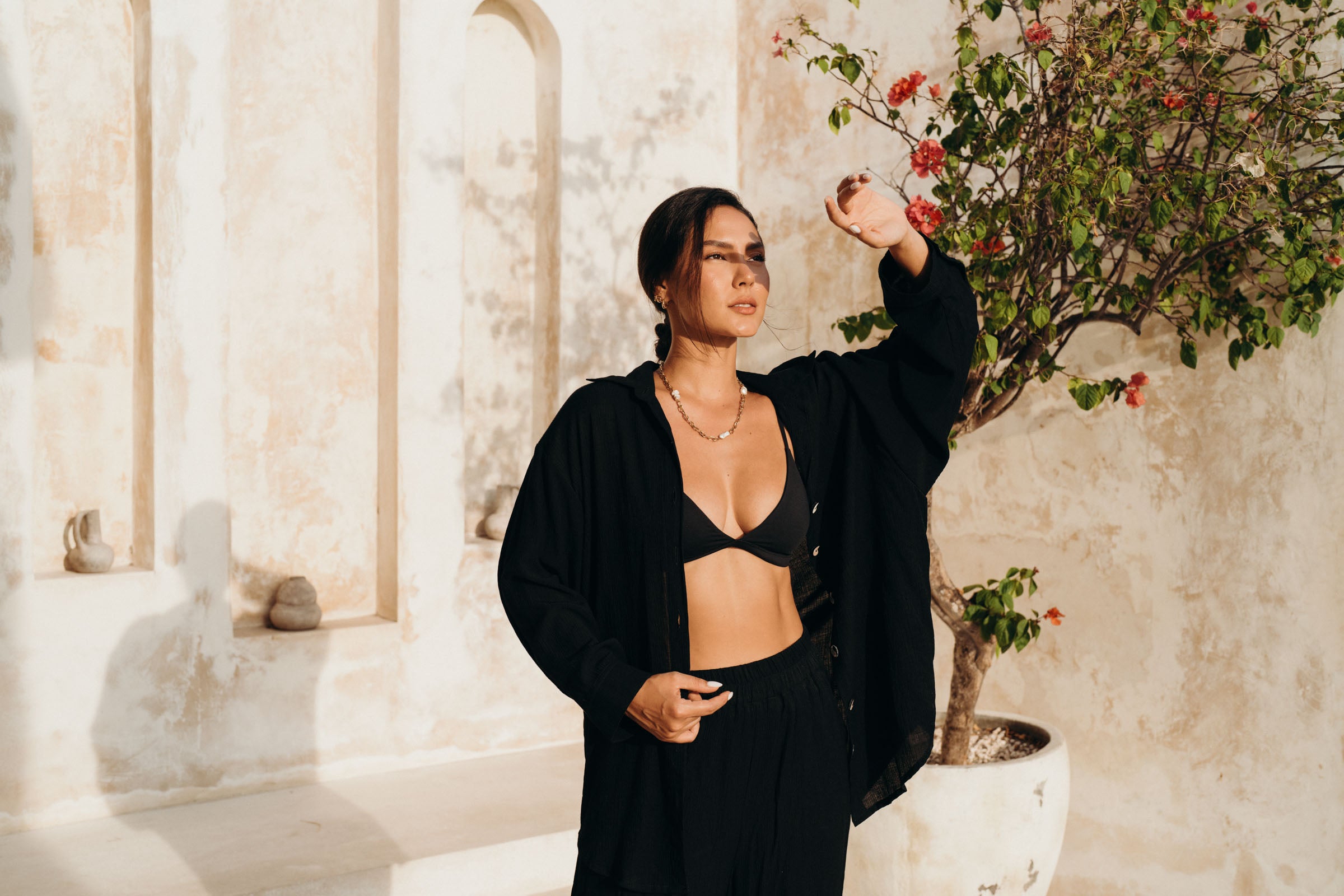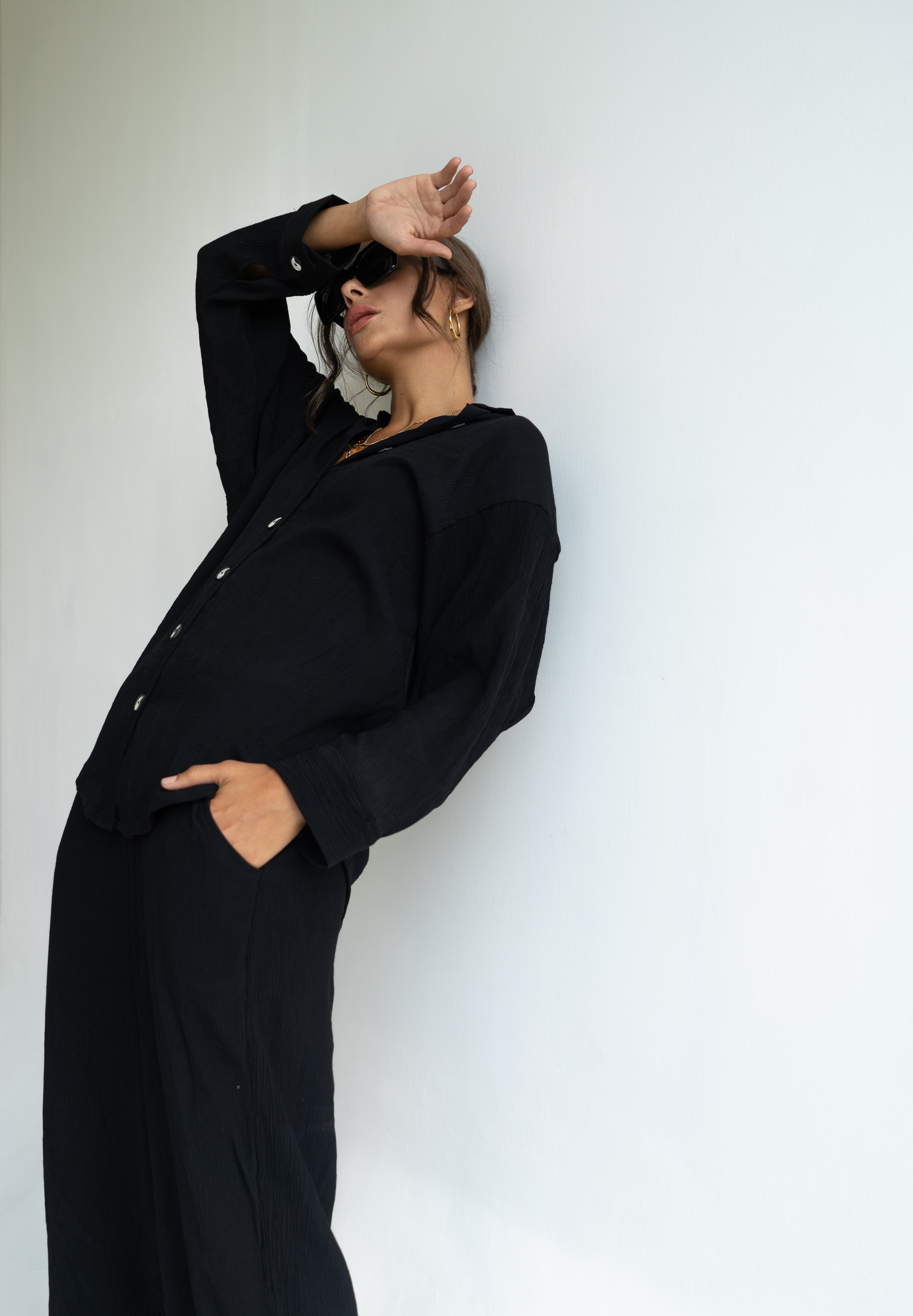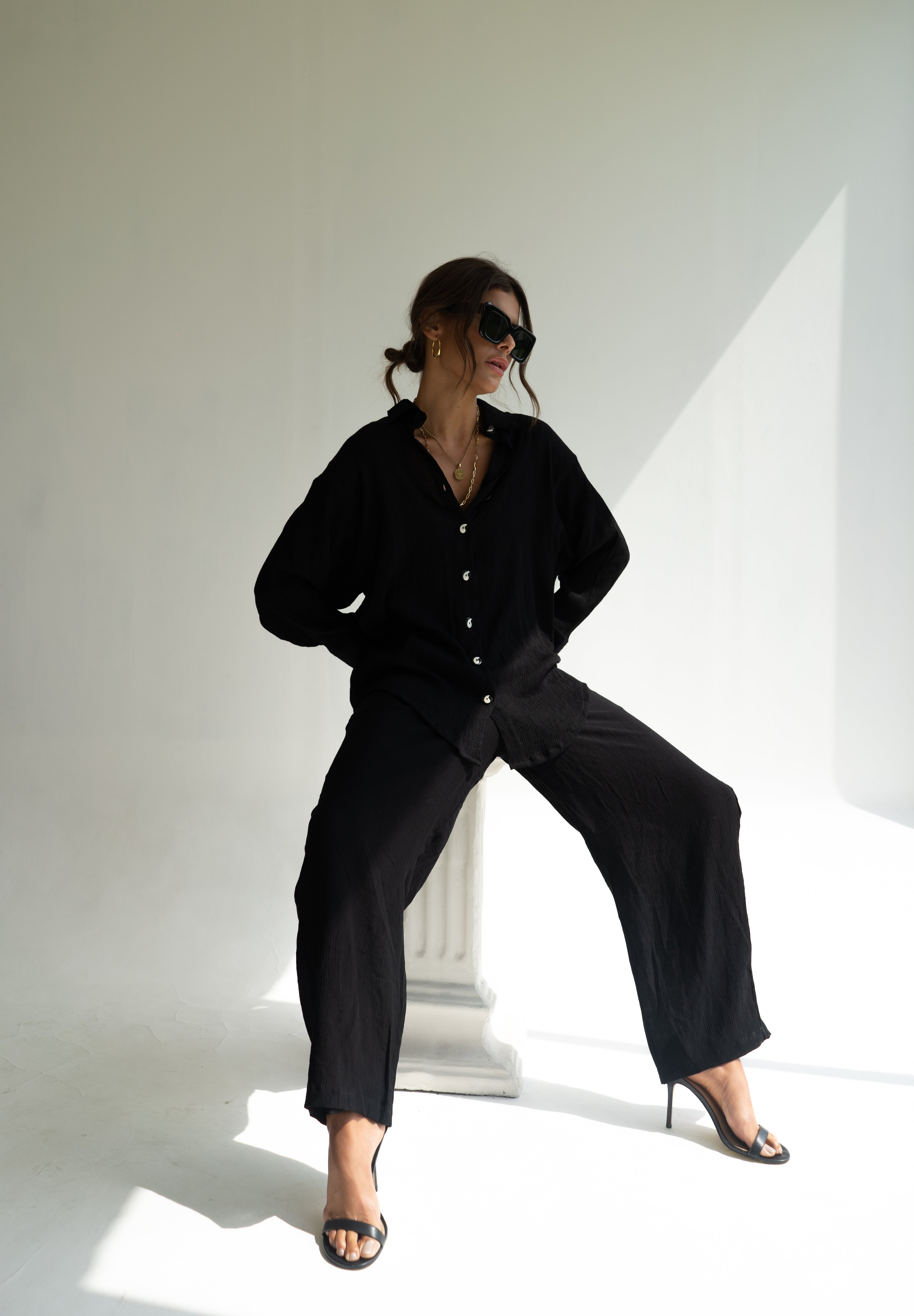 The Cotton Crepe Set is handcrafted from a smooth, textured 100% cotton crepe. It has a timeless oversized fit. The Pants have a comfortable waist elastic and the shirt has a unique Yin Yang design.