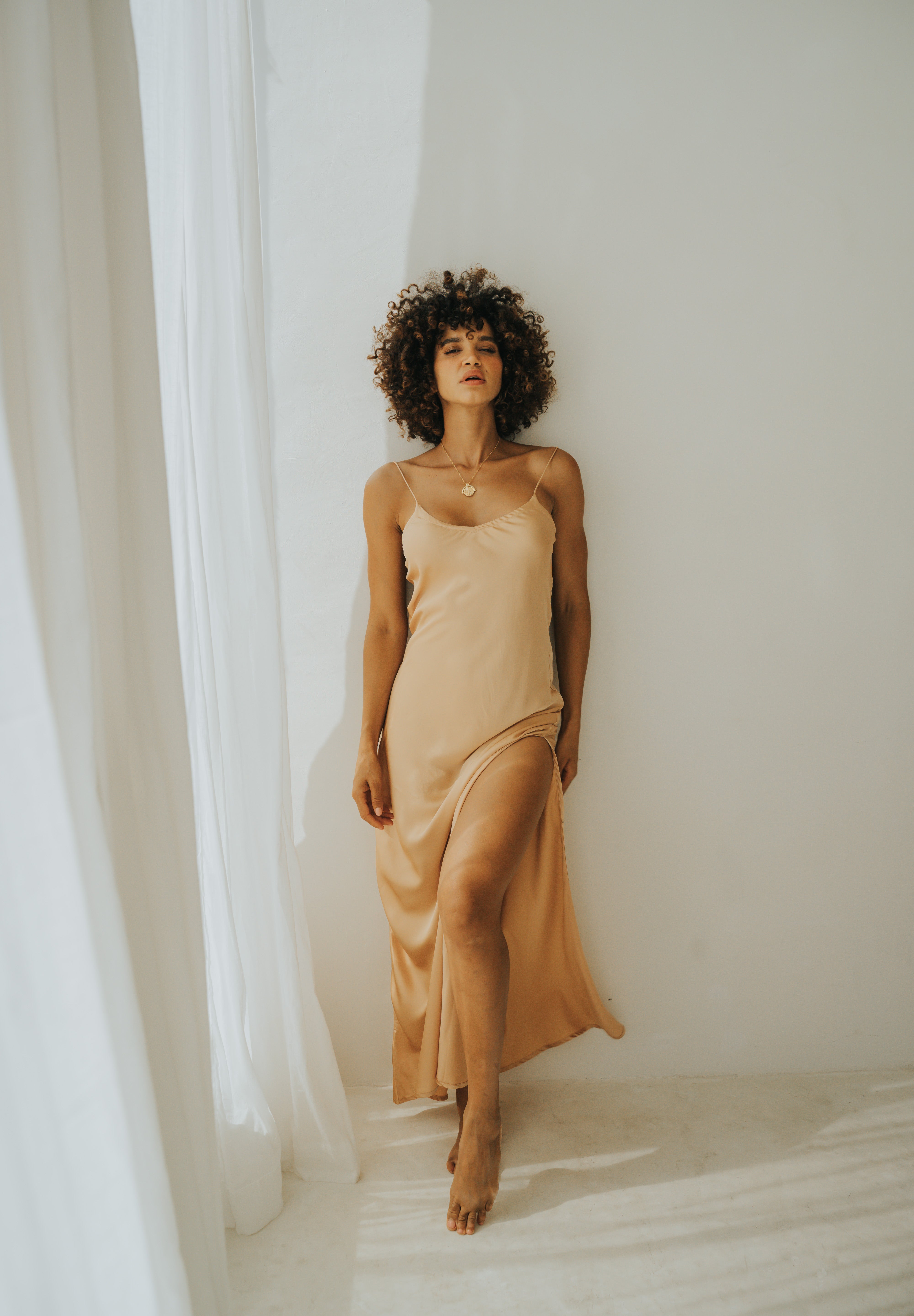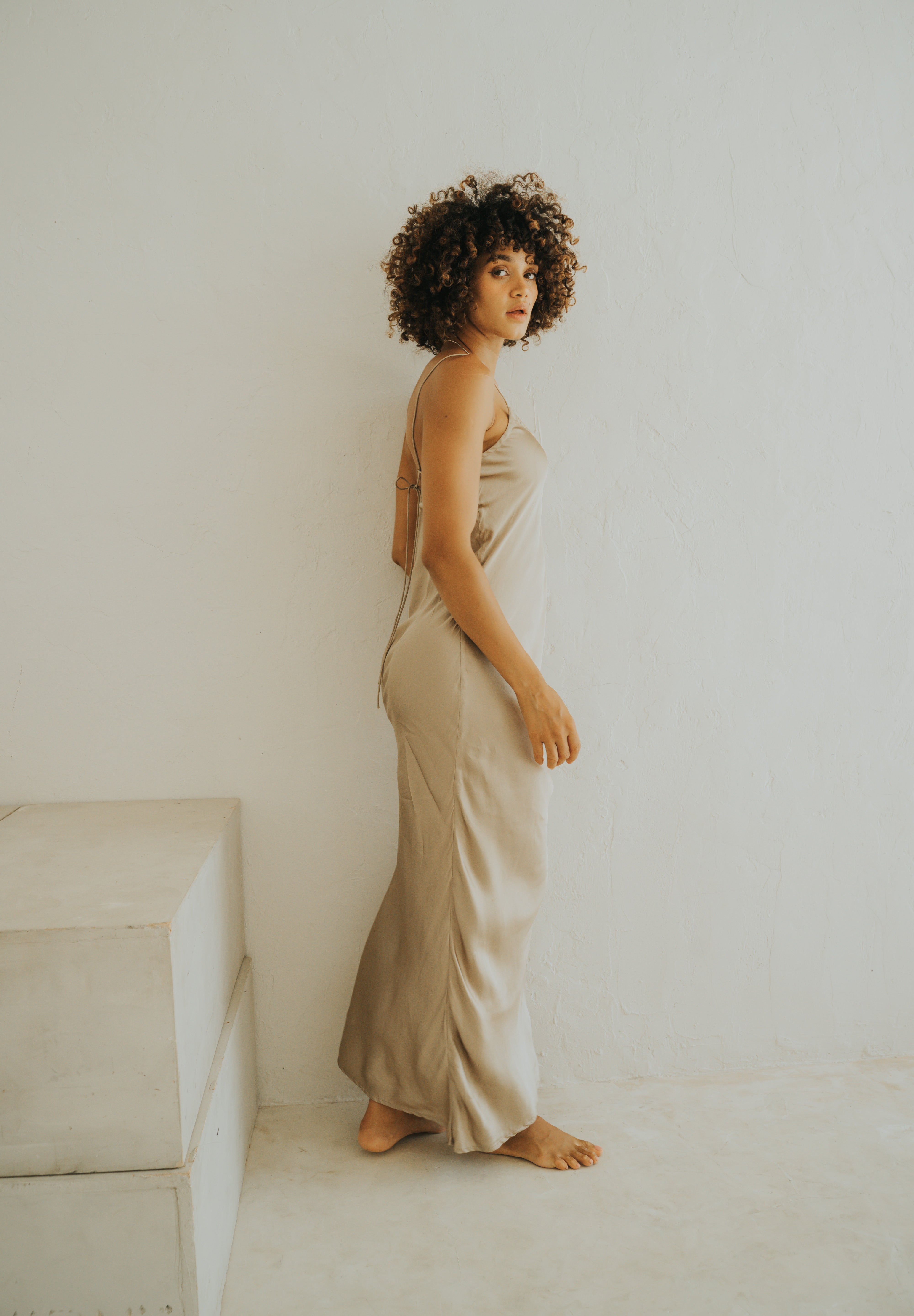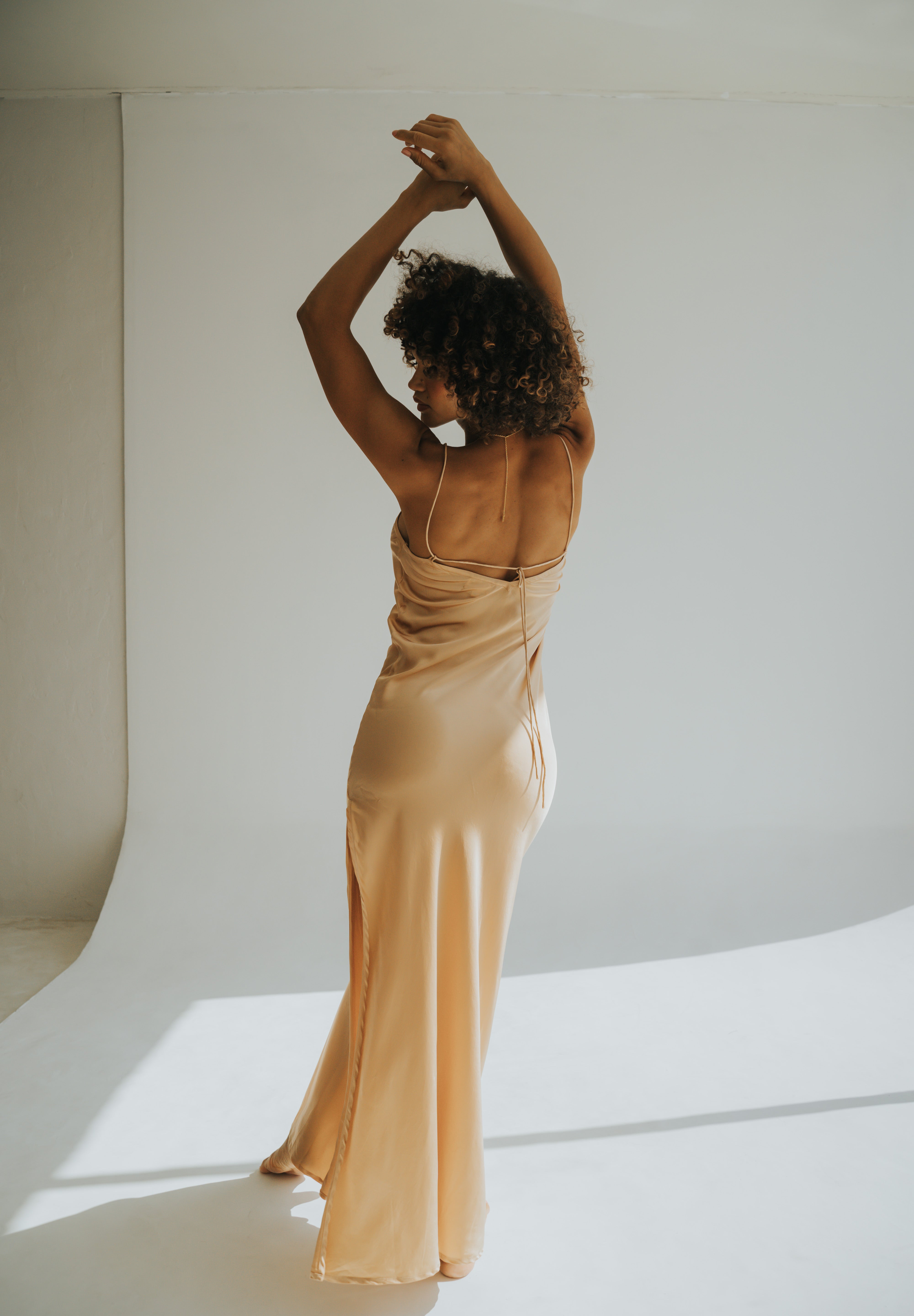 Faye is an A shaped maxi dress featuring two beautifully muted hand-dyed signature hues. The fabric is generously cut on the bias for a beautiful drape, made from sustainable satin that has a perfectly hugging stretch to it. Faye features a seductive low back, adjustable straps and a high side slit.