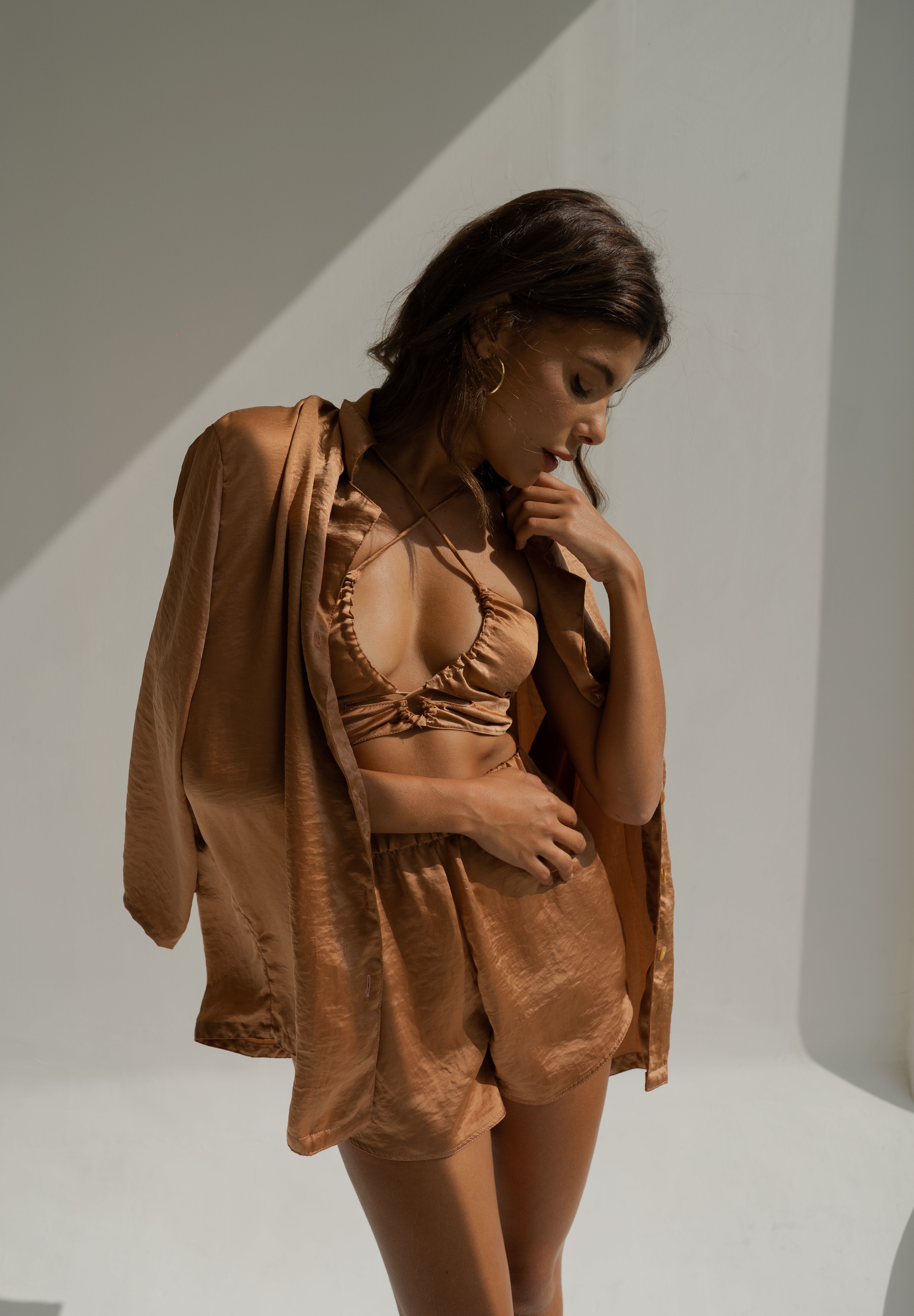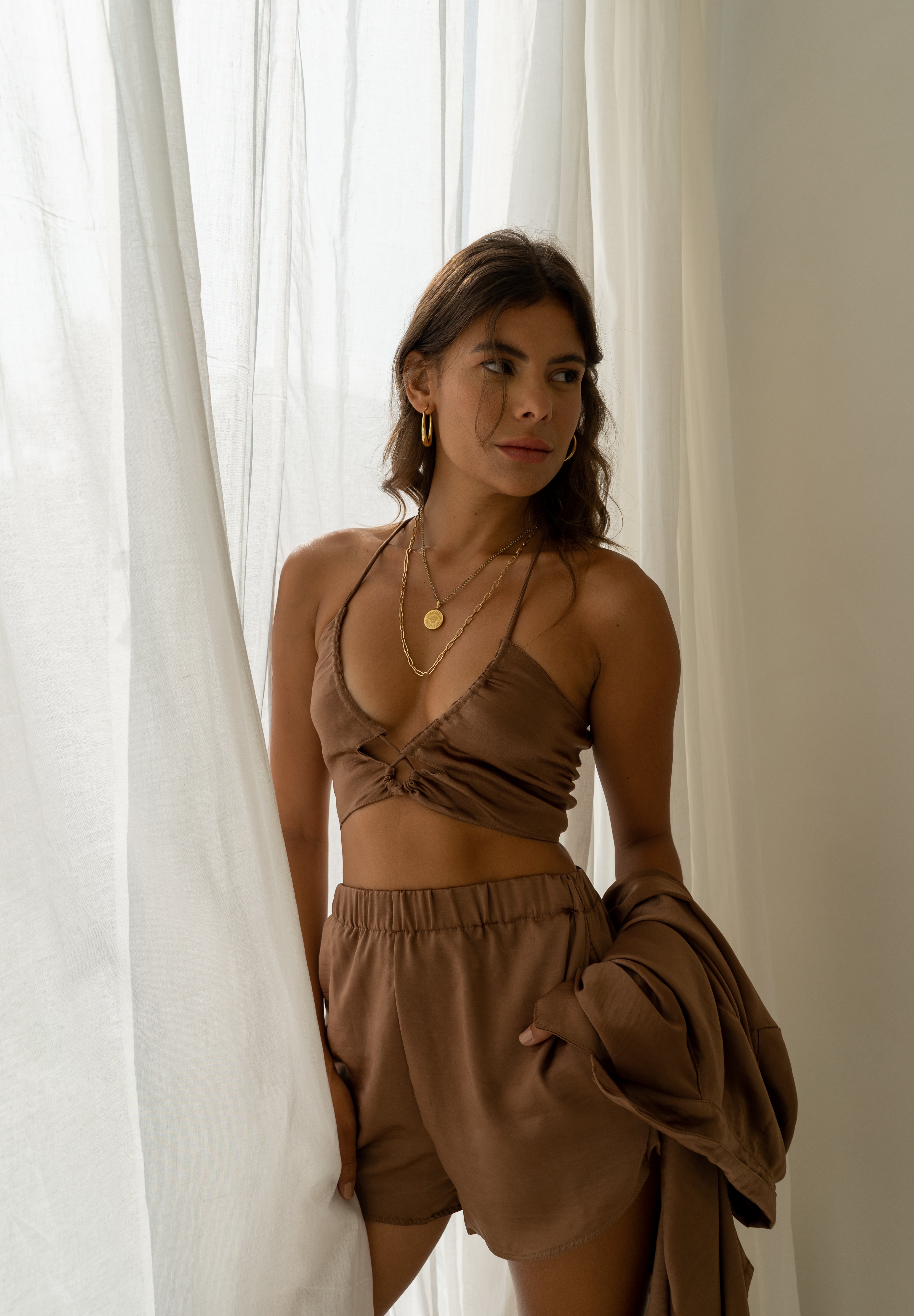 The Inana Cropped Set is a modern, elegant and versatile design that works well with effortless streetwear looks, cosy lavish home wear, and a sexy, luxe outfit to go out in.