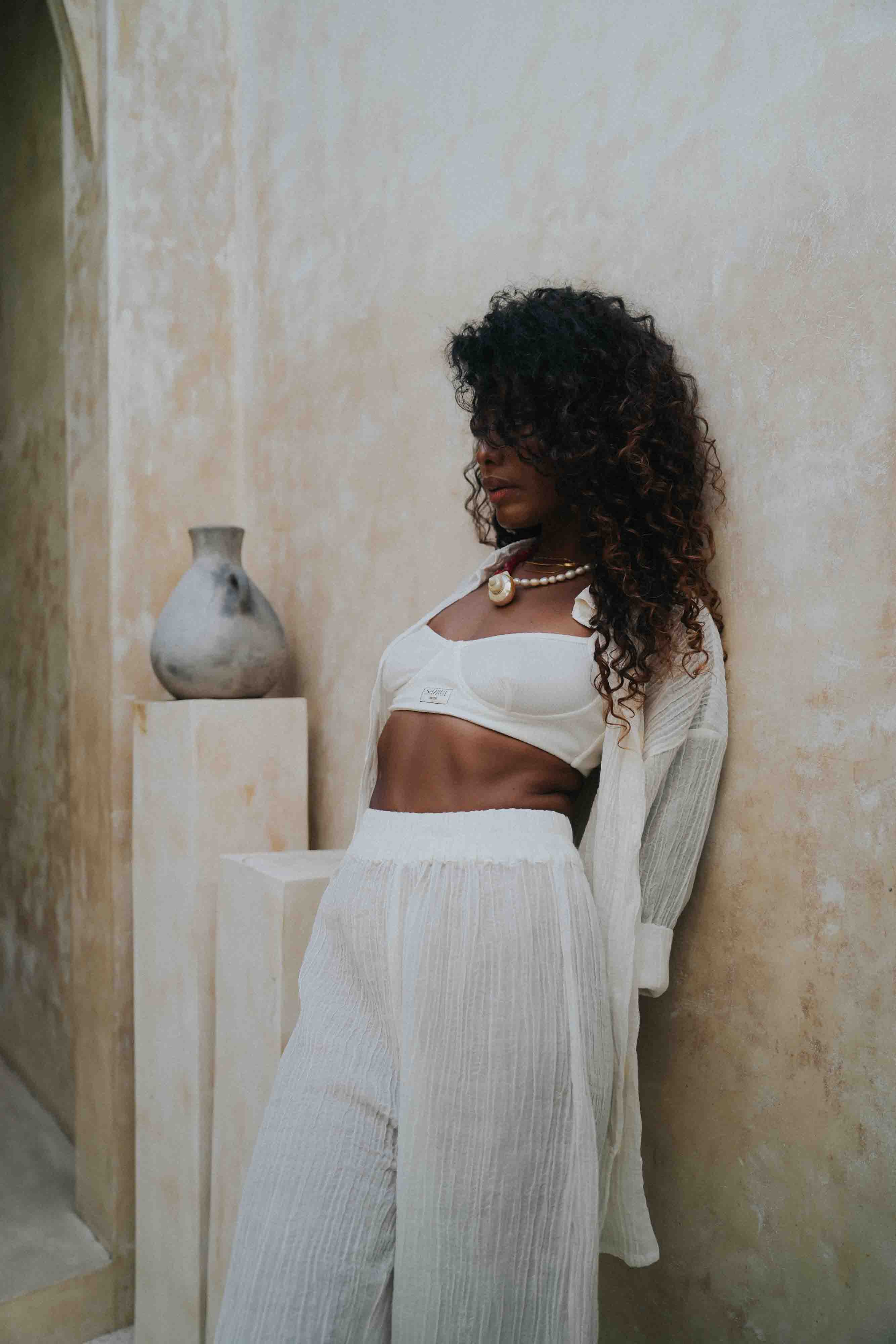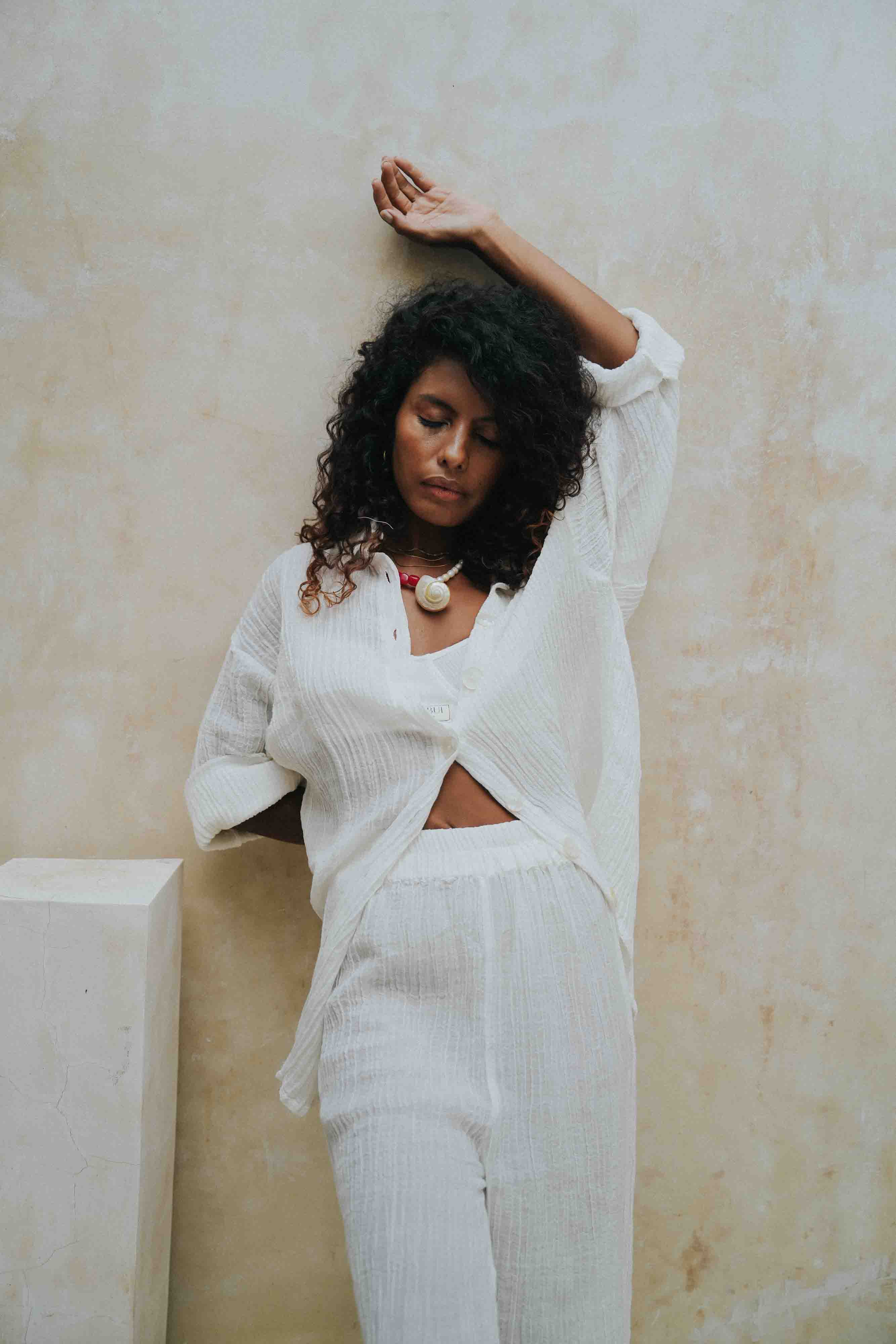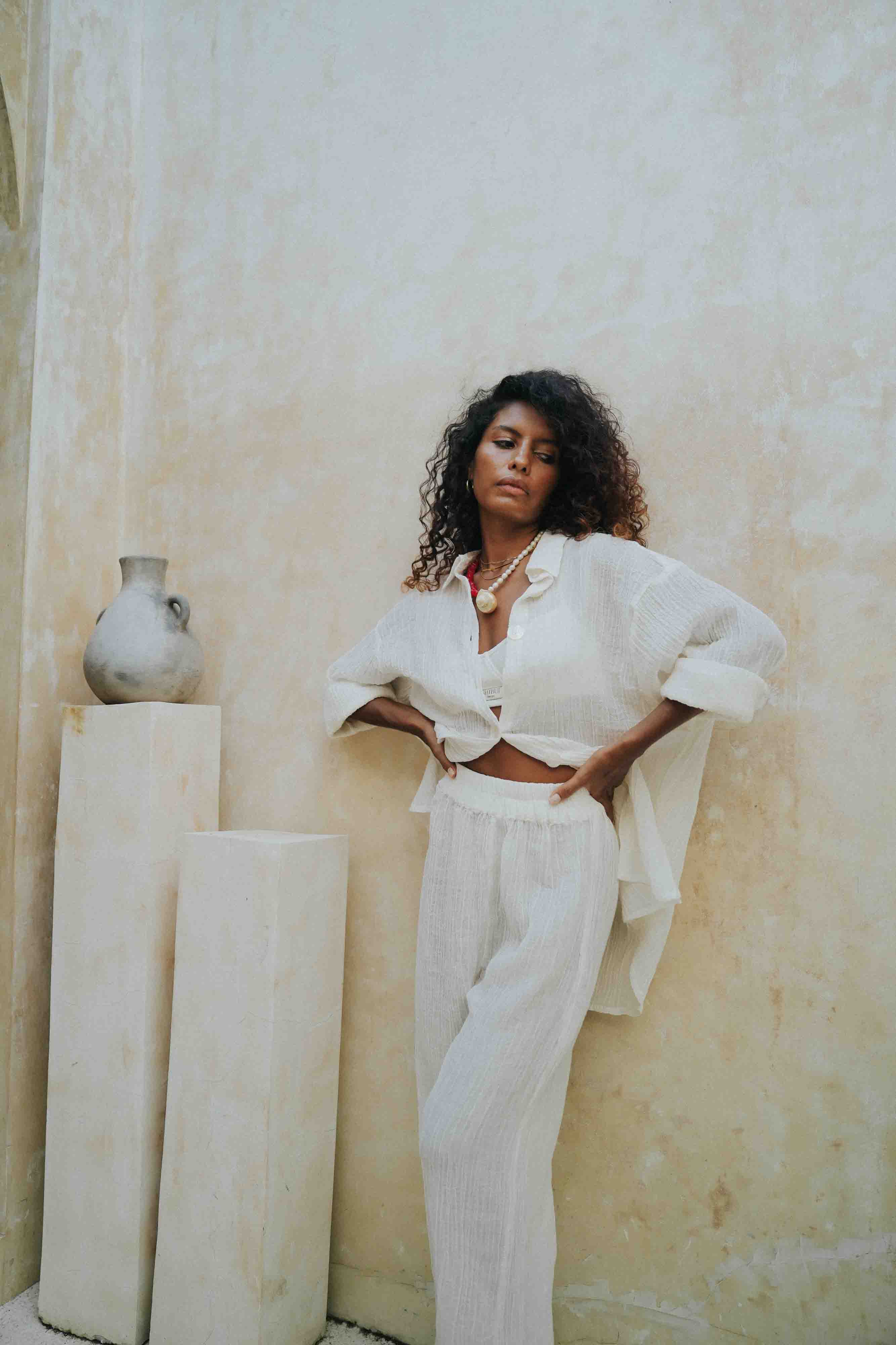 Introducing the La Mer Set, made from a semi sheer beautifully textured 70% linen 30% cotton Organza weave, it exudes sophistication and elegance while the relaxed oversized fit adds a relaxed, understated design. The pants are wide straight legged, featuring a comfortable soft elastic waist band. It allows for both comfortable lounging and relaxed layering as well as dressing up.