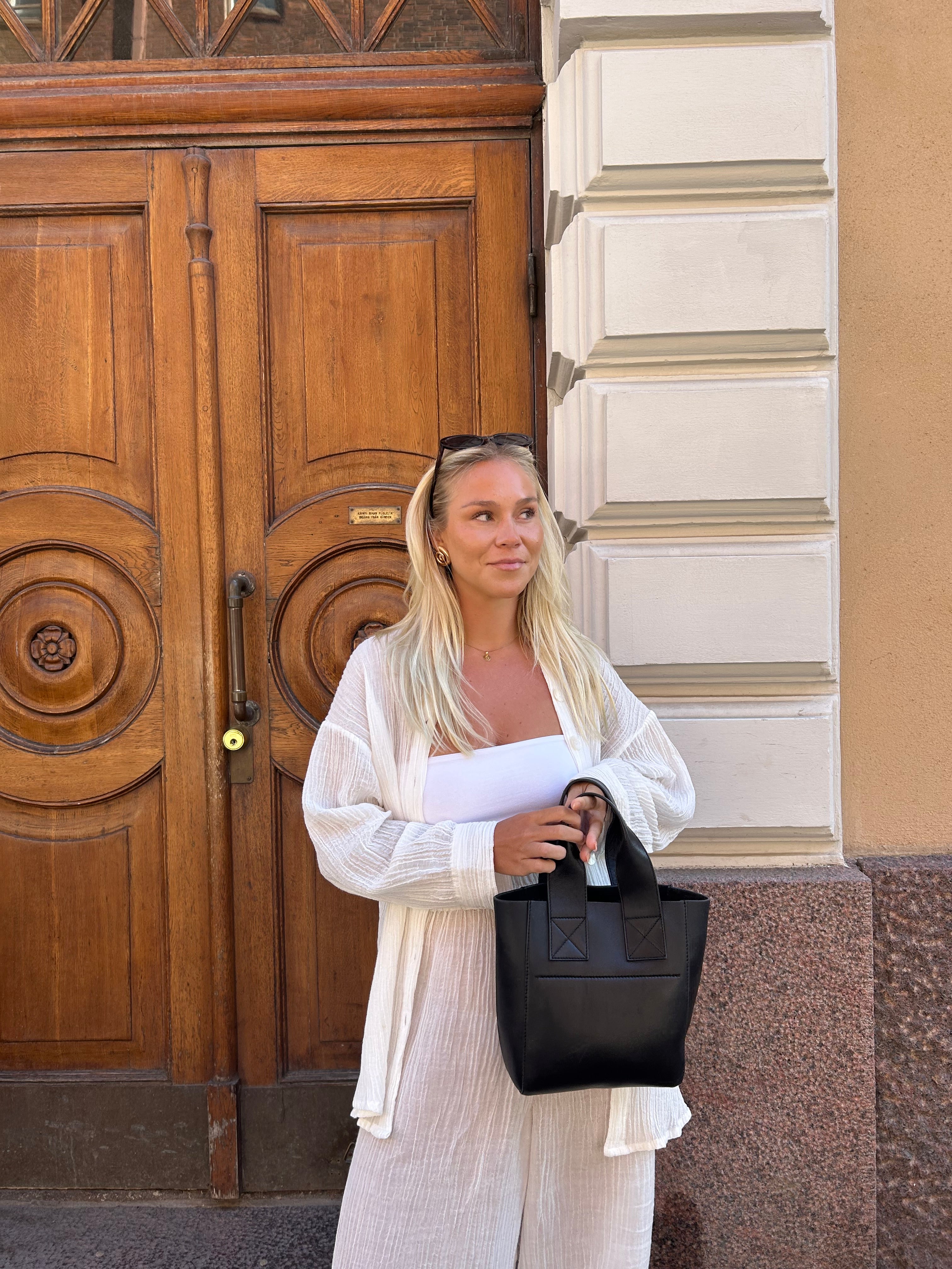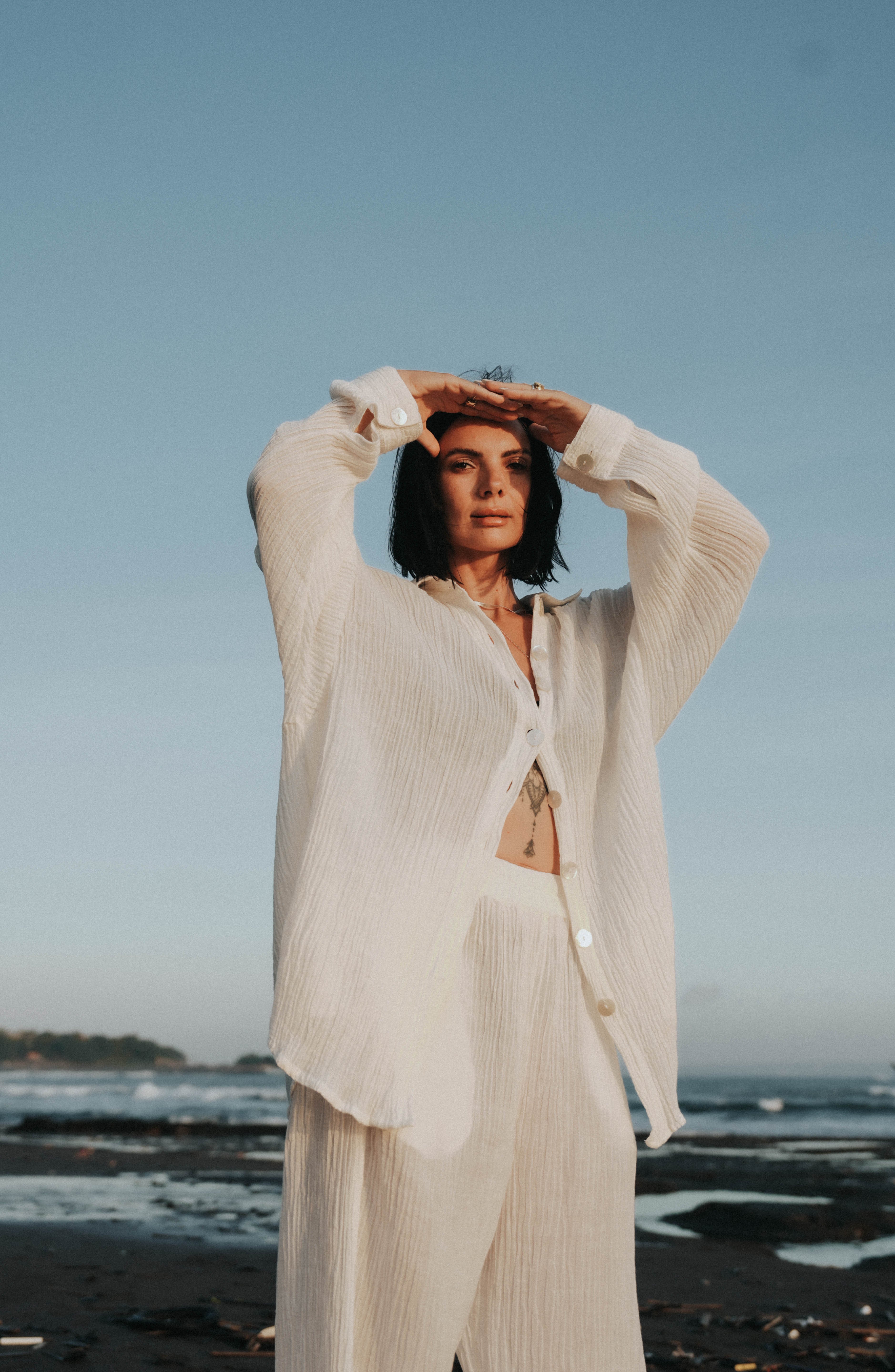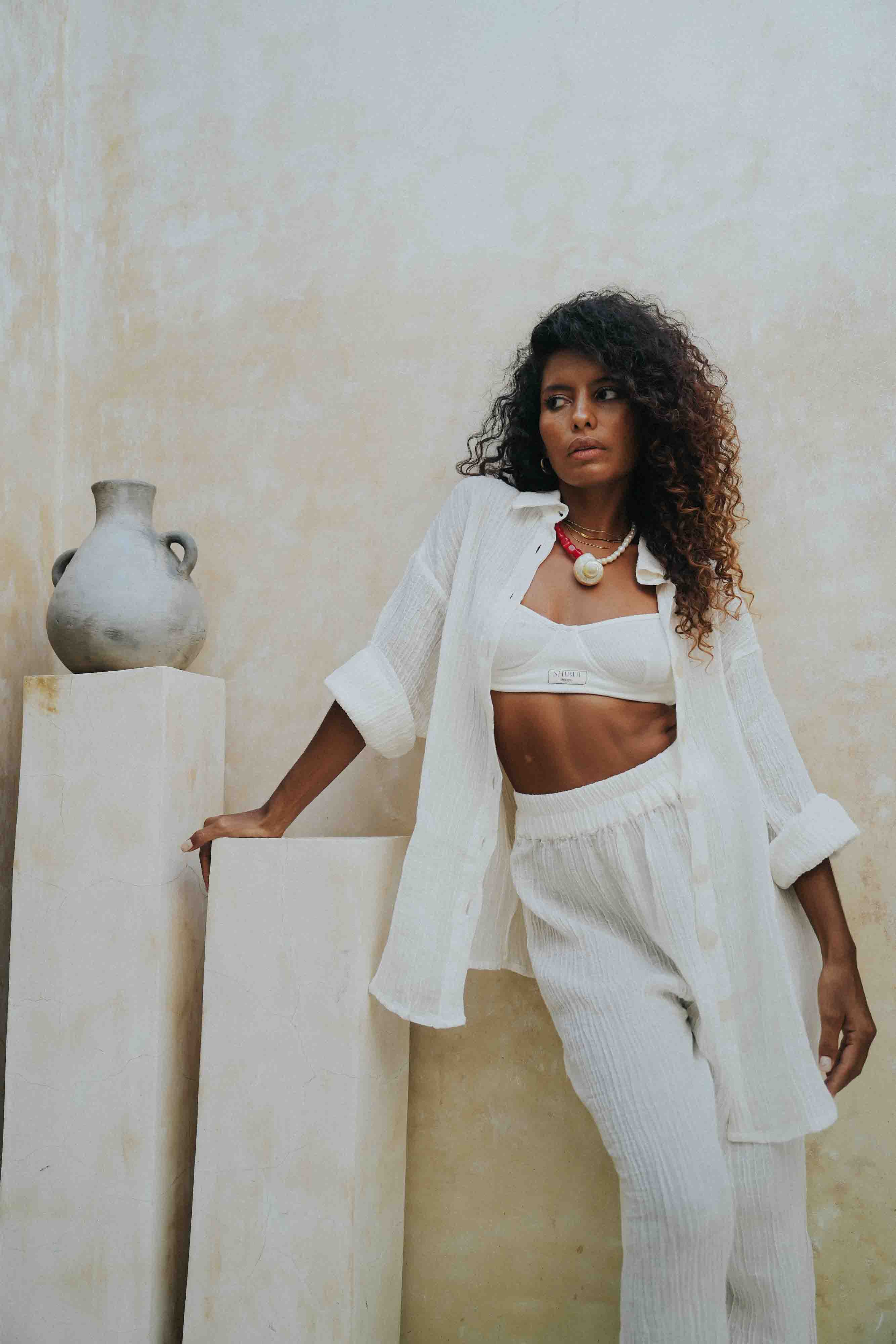 Introducing the La Mer Set, made from a semi sheer beautifully textured 70% linen 30% cotton Organza weave, it exudes sophistication and elegance while the relaxed oversized fit adds a relaxed, understated design. The pants are wide straight legged, featuring a comfortable soft elastic waist band. It allows for both comfortable lounging and relaxed layering as well as dressing up.