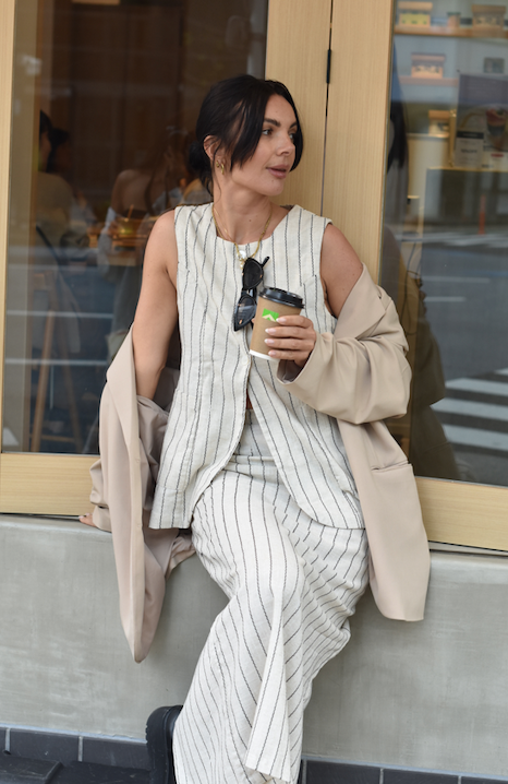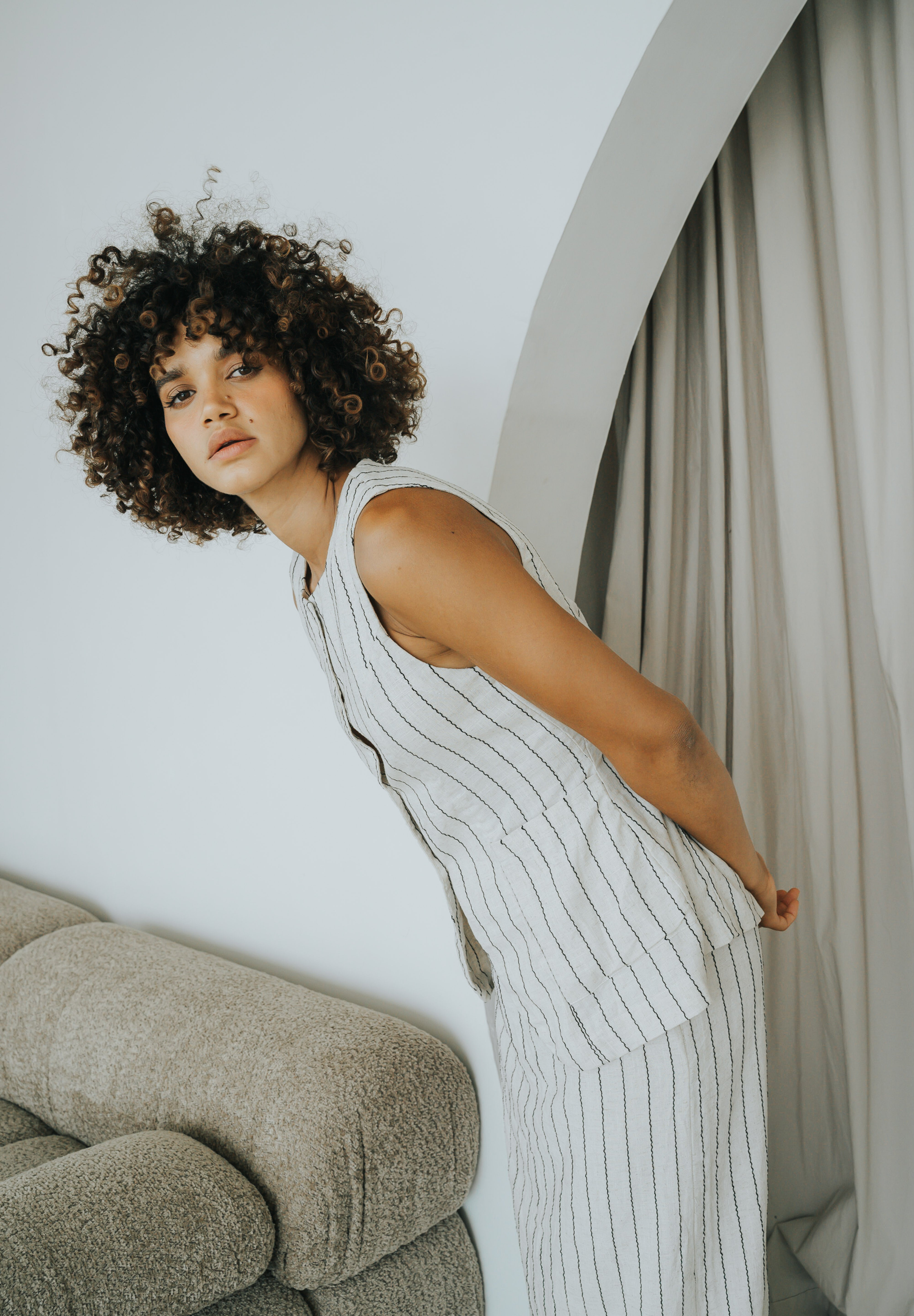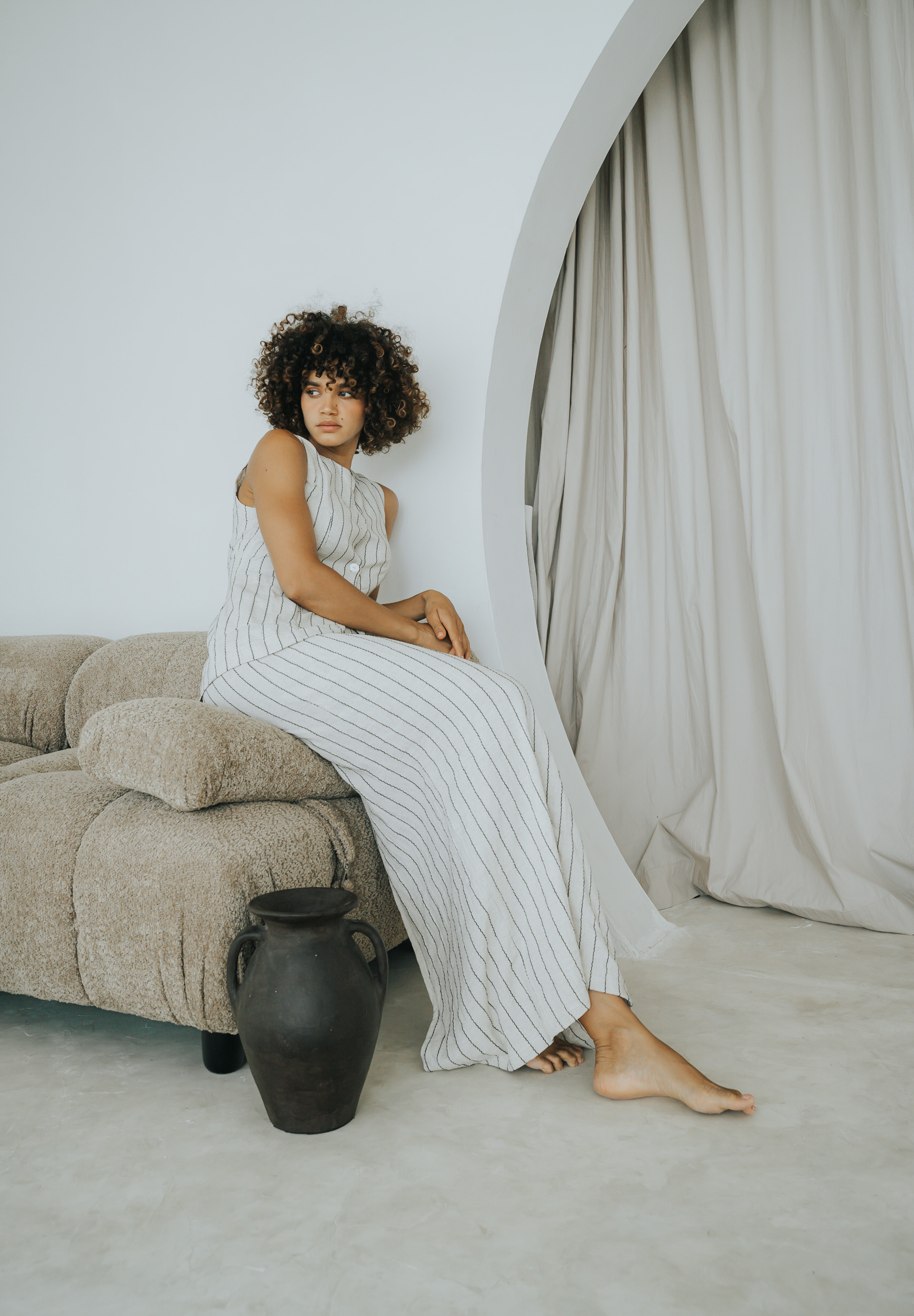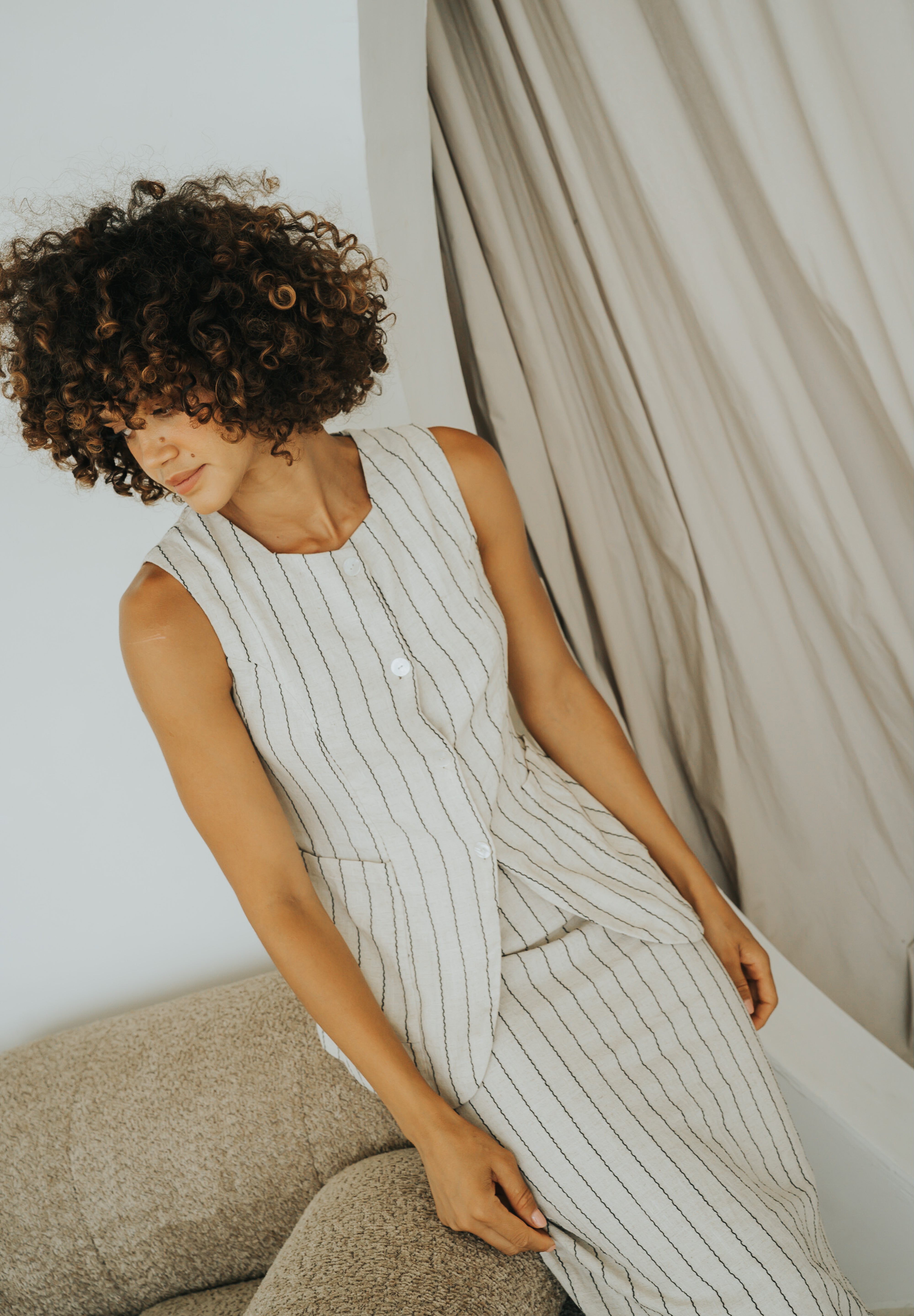 The Lucca Vest is crafted from a nicely breathable Linen/Rayon blend in a natural striped design. It features an elegant straight cut neckline, a waist accentuating fit with a stainless metal gold buckle in the back to cinch the waist, center front shell buttons and a statement curved peplum hem.