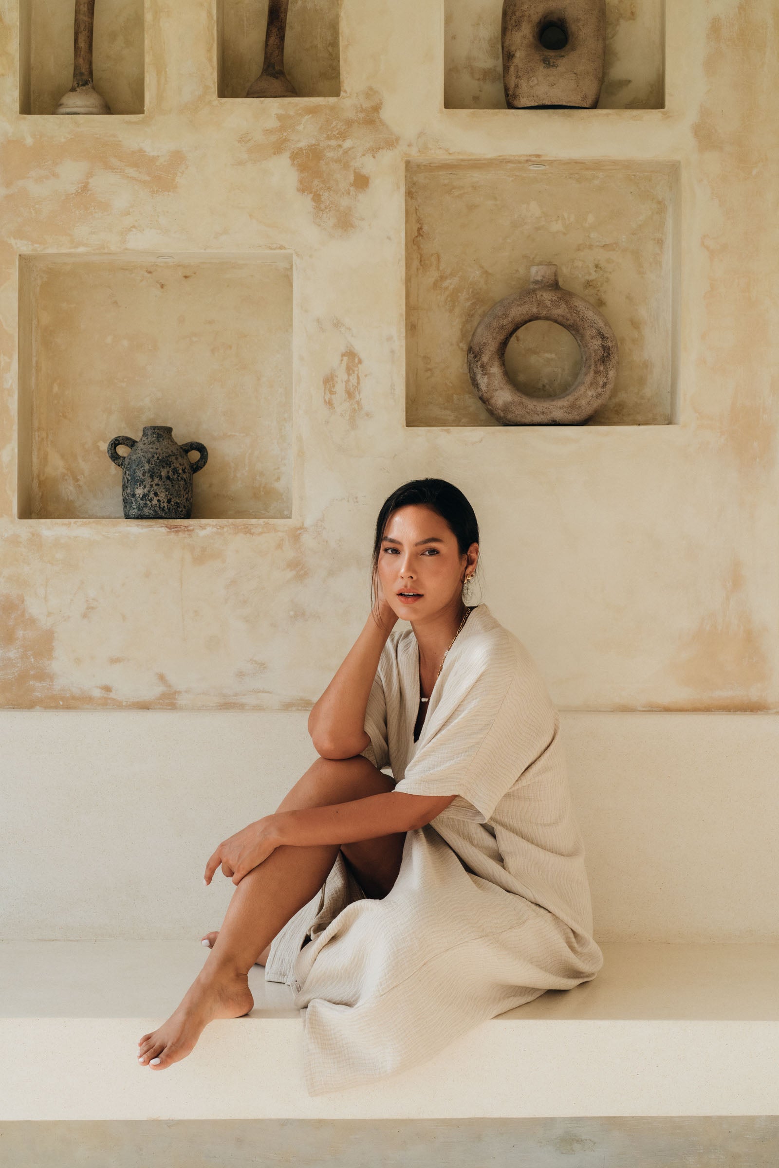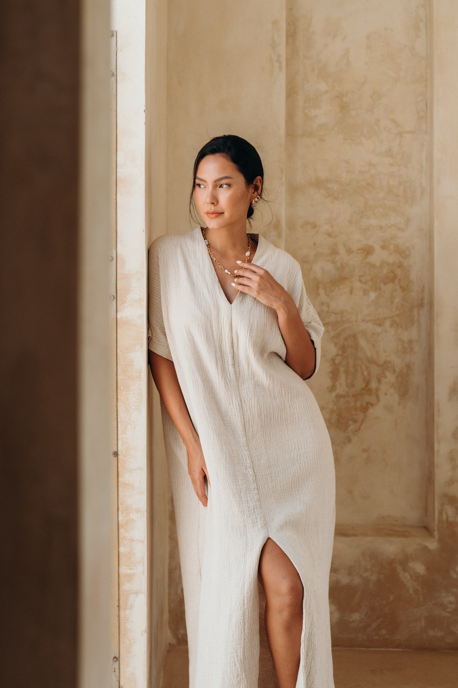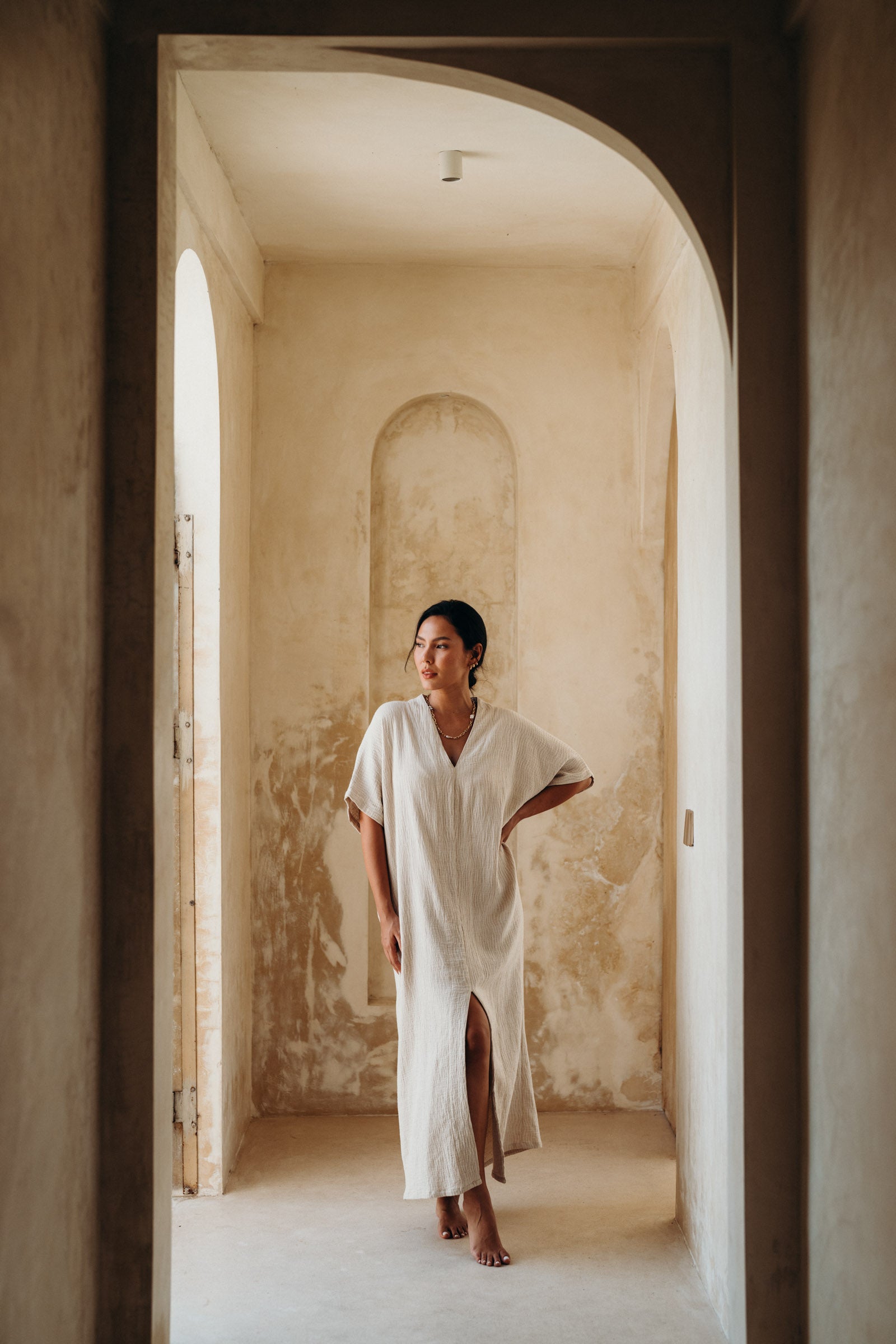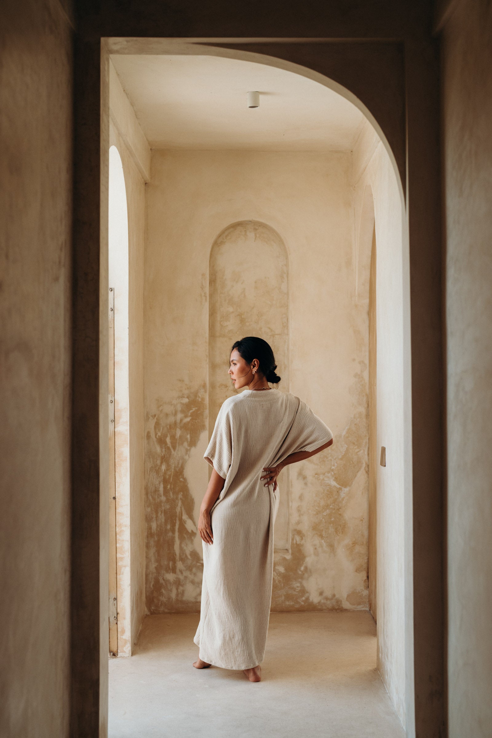 The Marrakech Kaftan is crafted from a unique and high-quality Cotton, Linen, and Rayon Blend with a traditional ombak weave in an oatmeal color. (Ombak means "wave" in indonesian")