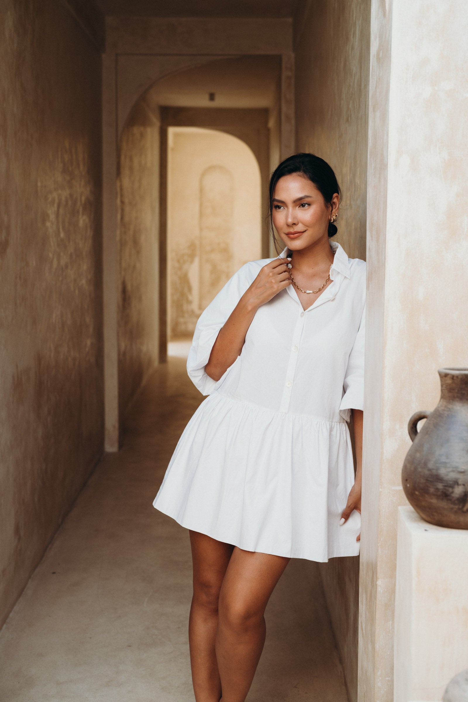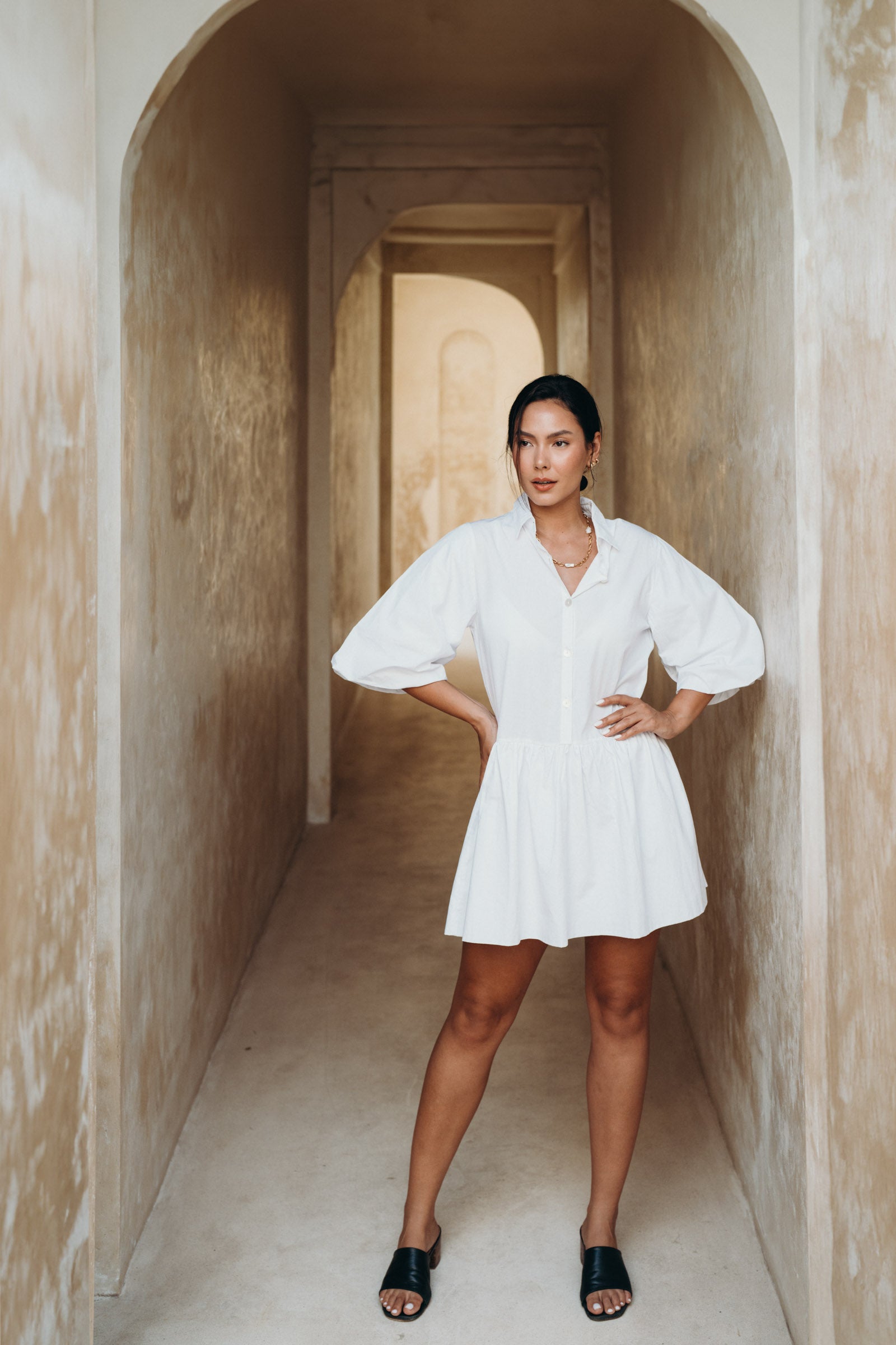 The Parisienne is a modern, chic every-day dress design with a unique accent of a double-layered skirt and puff sleeves and a button-up hand crafted from Poplin Terranova 100% pure cotton.
